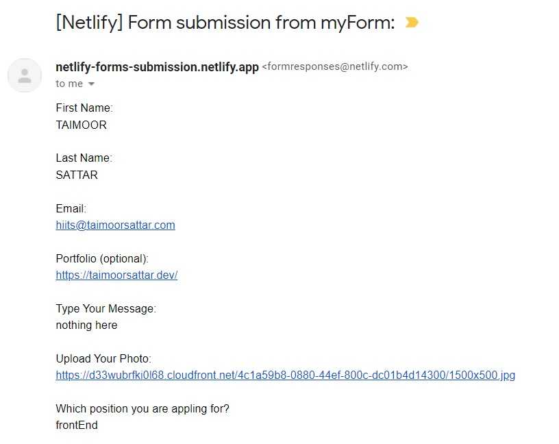 As soon as you set up email notification for the form submission in Netlify Dashboard, you will receive an email containing the following information: