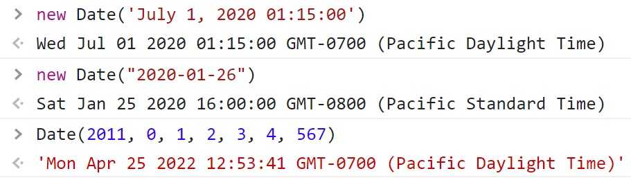 new Date('July 1, 2020 01:15:00')new Date("2020-01-26")// pattern: YYYY-MM-DDTHH:mm:ss:sssZDate(2011, 0, 1, 2, 3, 4, 567)