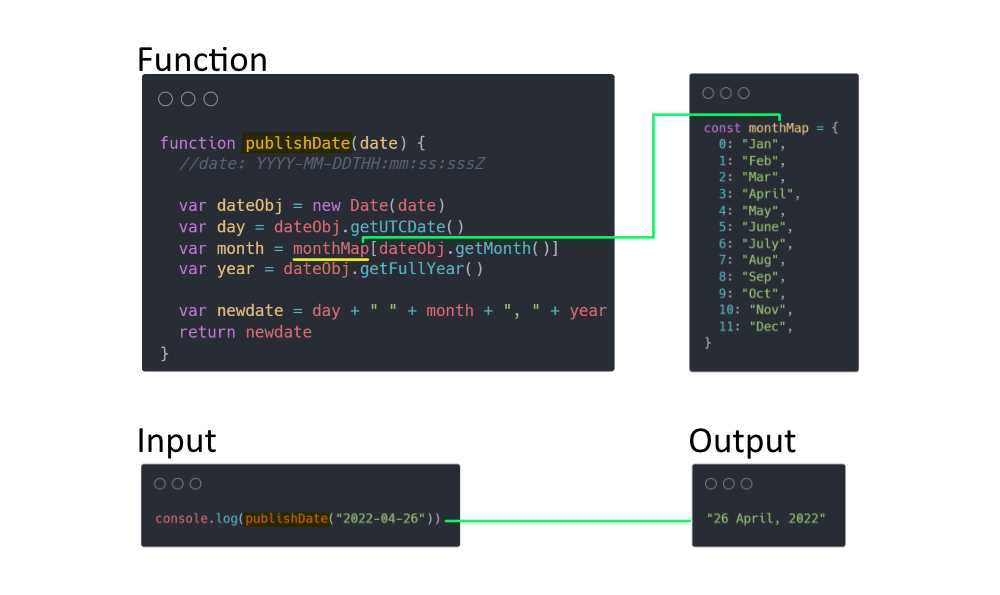 Let’s say we want to format the date "2022-04-26" into "26 April, 2022". As we can see, there is no getter function that returns the month in the alphabet. So we can map the numeric digits to alphabets as shown below. We can also use a logic statement to achieve a similar result.