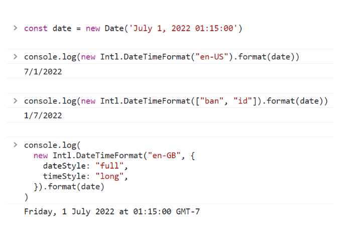 // Output: Friday, 1 July 2022 at 01:15:00 GMT-7If you are looking for a JavaScript date utility library, date-fns is a simple and consistent toolset for manipulating JavaScript dates in a browser & Node.js.