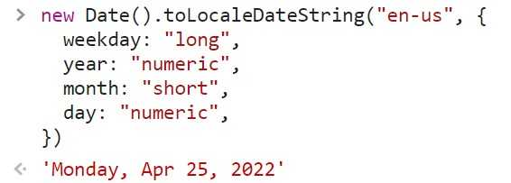 We can customize the toLocaleDateString() method of Javascript Date object to get our desired date formating as shown below