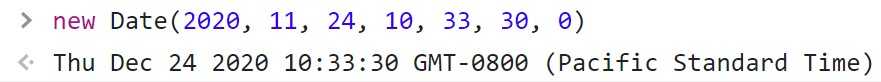 new Date(2020, 11, 24, 10, 33, 30, 0)The above code returns as follows: Thu Dec 24 2020 10:33:30 GMT+0300 (Arabian Standard Time) as shown in the below image.