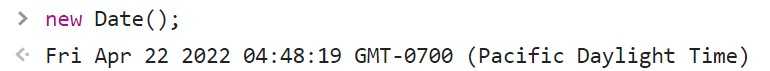 new Date() // shows current date/timeThe output of the above code is: Fri Apr 22 2022 04:48:19 GMT-0700 (Pacific Daylight Time). Date and Time output may vary depending on your time of execution of the command as shown in the below image.
