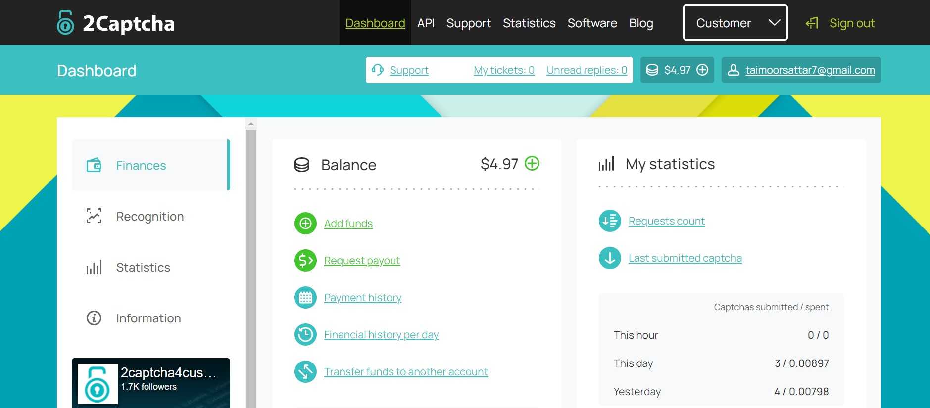 To Get Started with 2Captcha, You can register into the account as “I’m a customer”. After registration, You’ll be navigated to the dashboard as shown below.